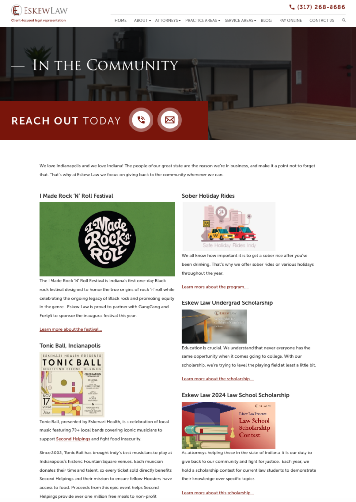 Successful reputation management for attorneys involves more than just professional achievements; it also encompasses involvement in the community. Participating in or sponsoring local events, offering free legal seminars, or engaging in charity initiatives can significantly improve the firm’s public image and regional standing, cementing its reputation as a committed and caring community player. As always, post about your community involvement on your website and social media profiles. Don’t be shy: This is the stuff that can make you stand out from the money-hungry pack! Eskew Law LLC does a great job of this: