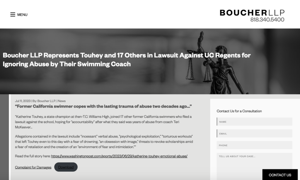 Developing relationships with journalists and bloggers in the legal domain and securing positive press coverage for the firm’s achievements can substantially impact law firm reputation management. Issuing press releases consistently is a great way to advertise the firm’s accomplishments, helping to maintain visibility and enhance reputation. Don’t forget to republish press releases and mentions on your website—it helps spread the word about your work and boosts SEO. Here’s an example from Boucher LLP: