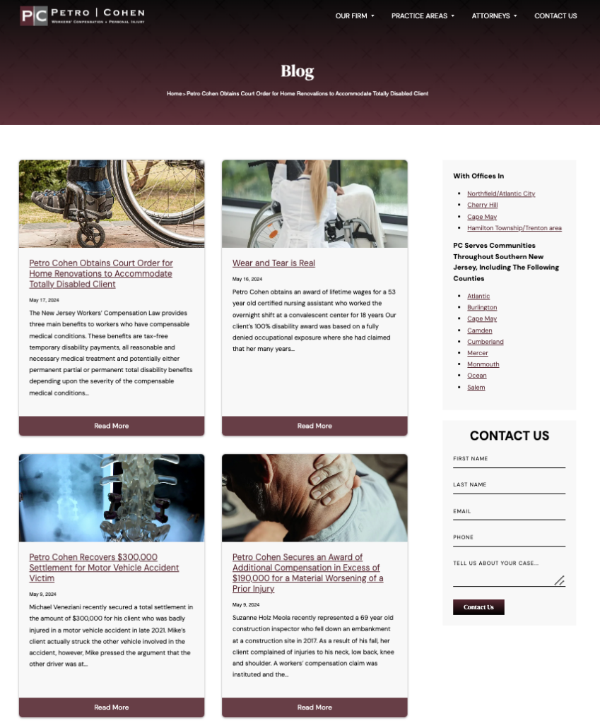 Law firm online reputation management extends to maintaining a robust, up-to-date website with practical, authoritative content. Regularly publishing blog posts, case studies, and legal analyses can improve SEO rankings and showcase the firm’s expertise, a cornerstone of reputation management for law firms. Take a look at how personal injury firm Petro Cohen does it: