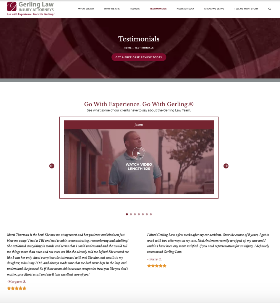 Creating a dedicated section on your website for client testimonials consolidates trust. It supports law firm online reputation management by providing direct proof of client satisfaction and competency, increasing the attractiveness to prospective clients. A great example of this can be found on the website of Gerling Law Injury Attorneys.