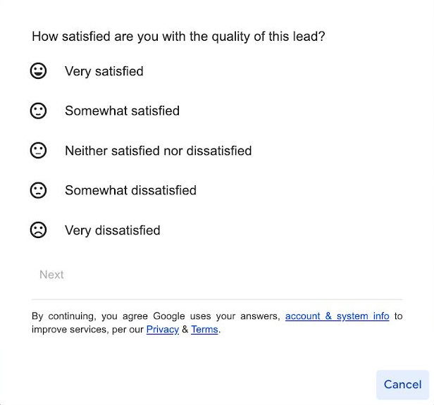 The recent update insists that businesses rate their leads to assist AI’s understanding of a qualified versus unqualified lead. The lead dashboard has been updated to replace the “Dispute” option with a “Rate this lead” button. This new feature allows you to provide feedback on lead quality through a pop-up window with the following satisfaction options: